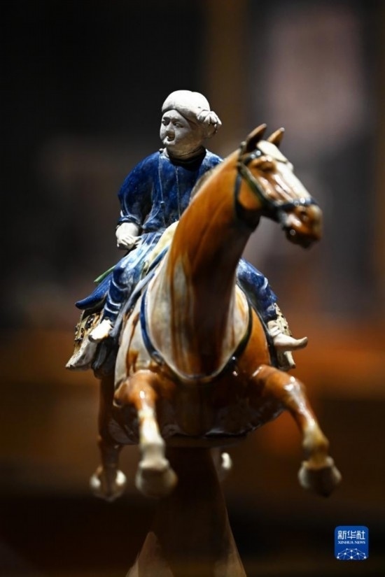 這是在西安博物院展出的唐代三彩騰空馬(5月8日攝)。飛騰的三彩馬上騎有一胡俑,真實(shí)再現(xiàn)了絲綢之路上西域胡人急奔長安的生動形象。