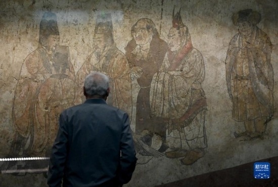 5月11日,游客在陜西歷史博物館內(nèi)觀看唐章懷太子墓《客使圖》?!犊褪箞D》描繪的是唐代外交機(jī)構(gòu)鴻臚寺官員接待外國使節(jié)的場景。