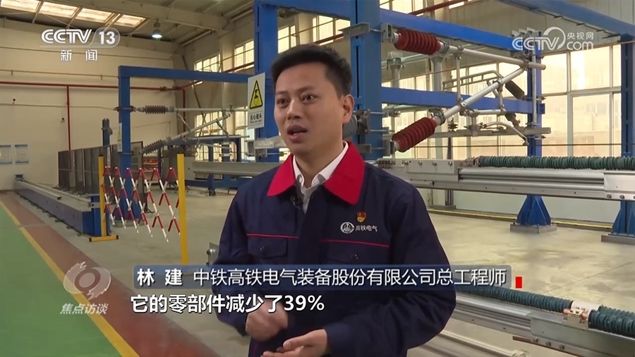 中鐵高鐵電氣裝備股份有限公司總工程師林建:“簡(jiǎn)統(tǒng)化腕臂裝置相對(duì)于傳統(tǒng)的鋁合金三角腕臂裝置來說,它的零部件減少了39%,在運(yùn)營(yíng)過程中,在同等滿足系統(tǒng)使用要求情況下,零部件越少,故障率越小,安全可靠性就會(huì)更高。”