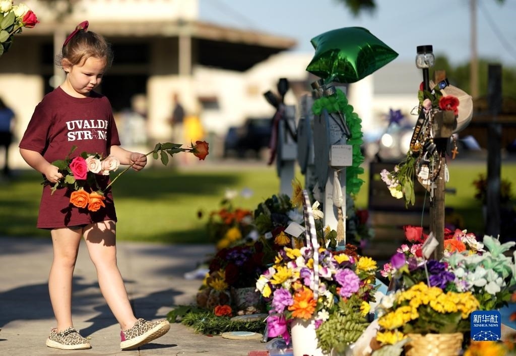 5月24日,在美國(guó)得克薩斯州小城尤瓦爾迪的廣場(chǎng)上,一名女孩獻(xiàn)上鮮花悼念校園槍擊遇害者。