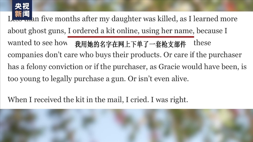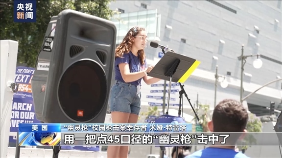 “幽靈槍”校園槍擊案幸存者 米婭·特雷塔:當時我們正在談笑,突然聽見“砰”的一聲槍響,當?shù)诙晿屄曧懫饡r我已經(jīng)跌倒在地上。我爬起來,跑進教室里,同學和老師急忙為我止血,我被一名不認識的同校學生,同時也是一個未成年人,用一把點45口徑的“幽靈槍”擊中了。