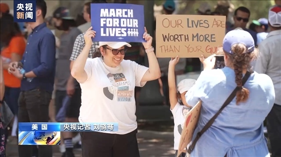 央視記者 劉驍騫:每年六月中旬,美國各地都會舉行大規(guī)模的控槍游行。這里是洛杉磯市中心的格蘭德公園,正在舉行的這種活動的號召人之一就是“幽靈槍”的受害者。