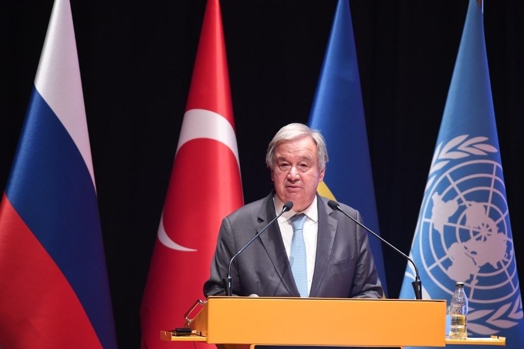 2022年8月20日,在位于土耳其伊斯坦布爾的土耳其國防大學(xué)內(nèi)的黑海糧食外運(yùn)聯(lián)合協(xié)調(diào)中心,聯(lián)合國秘書長(zhǎng)古特雷斯出席新聞發(fā)布會(huì)。新華社記者沙達(dá)提攝