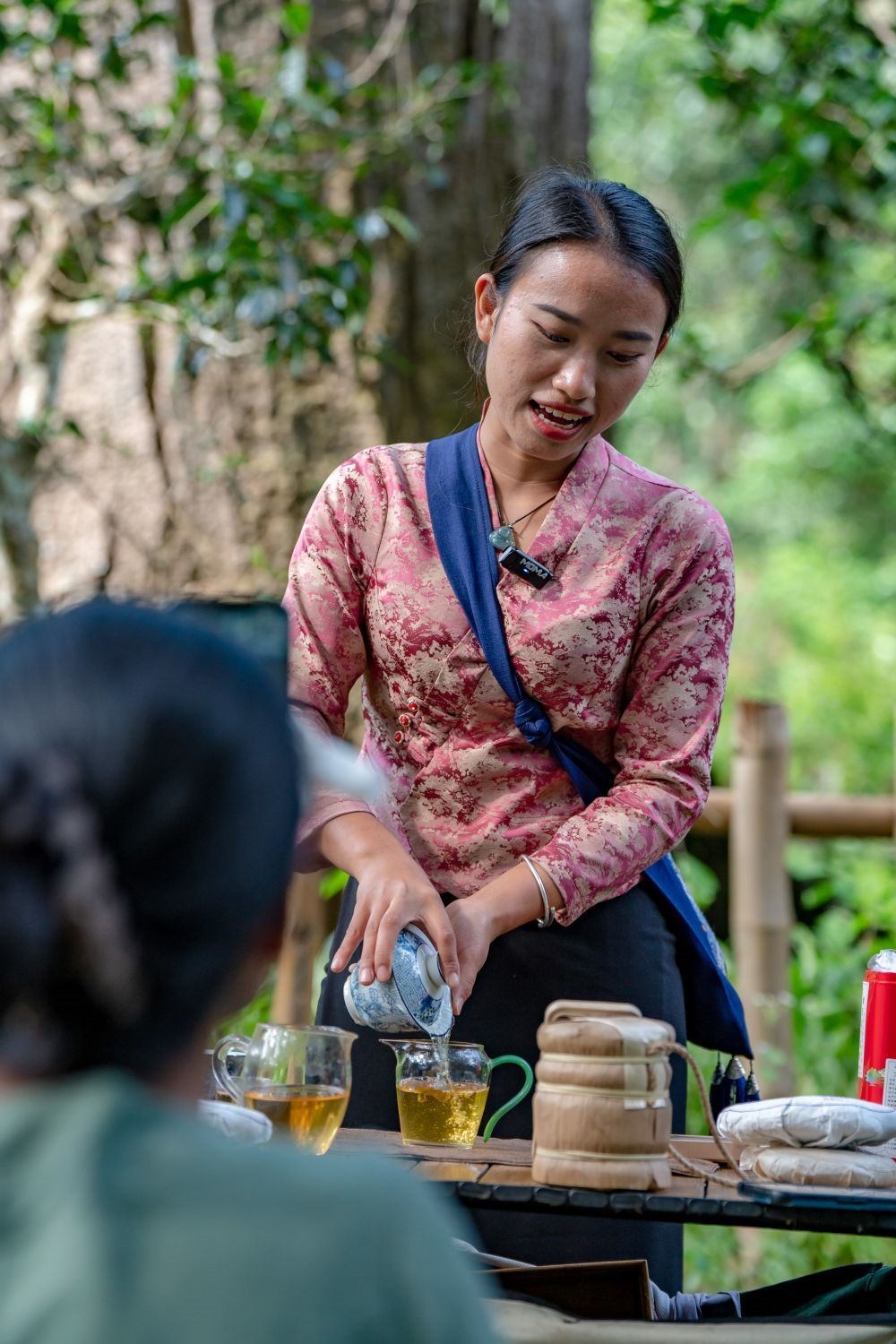 在景邁山大平掌古茶林,一位傣族姑娘在直播賣茶(9月14日攝)。新華社記者 胡超 攝