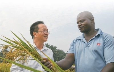 6月20日,在布隆迪布班扎省吉漢加縣,中國(guó)農(nóng)業(yè)專家組組長(zhǎng)楊華德(左)和當(dāng)?shù)剞r(nóng)民在稻田間交流。新華社記者 韓 旭攝