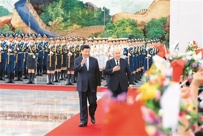 | 七月十八日下午,國(guó)家主席習(xí)近平在北京人民大會(huì)堂同來(lái)華進(jìn)行國(guó)事訪(fǎng)問(wèn)的阿爾及利亞總統(tǒng)特本舉行會(huì)談。這是會(huì)談前,習(xí)近平在人民大會(huì)堂北大廳為特本舉行歡迎儀式。新華社記者 翟健嵐攝 |