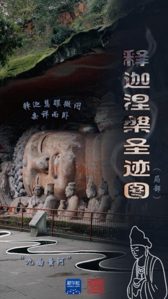 釋迦涅槃圣跡圖龕高7米、寬32米、深5米,刻像37尊。釋迦慧眼微閉,安詳而臥。佛像雙腳隱入巖際,右肩陷于地下,以有限的畫面表現(xiàn)了無(wú)限的藝術(shù)形象。
