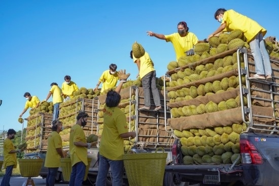 2021年5月30日,在重慶洪九果品股份有限公司位于泰國尖竹汶府的工廠內,工作人員在裝運即將銷往中國的榴蓮。新華社發(fā)