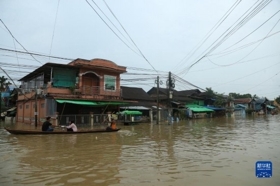 這是8月12日拍攝的緬甸勃固鎮(zhèn)洪災(zāi)區(qū)。新華社發(fā)(苗覺梭攝)