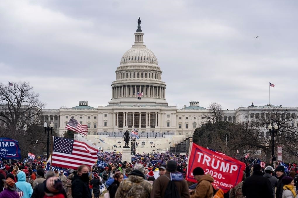 2021年1月6日,在美國首都華盛頓,時任總統(tǒng)特朗普的支持者在國會外舉行示威游行。部分示威者沖進國會大廈,與警方發(fā)生沖突。新華社記者劉杰攝