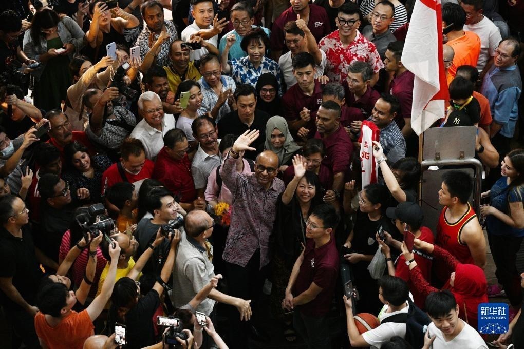 9月1日,新加坡總統(tǒng)候選人尚達(dá)曼(中)在裕廊等待總統(tǒng)選舉結(jié)果揭曉時(shí)向支持者致意。新華社發(fā)(鄧智煒攝)