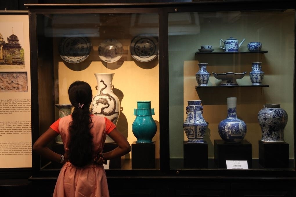 2014年9月15日,在斯里蘭卡首都科倫坡,游客參觀斯里蘭卡國家博物館展出的當?shù)爻鐾恋闹袊糯善鳎恍┲袊怃N瓷器上還繪有南亞、伊斯蘭風情,與鄭和碑共同見證著古代海上絲綢之路和中斯友好交往的源遠流長。 新華社記者馮武勇攝