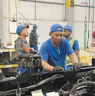 中國(guó)第一汽車(chē)集團(tuán)有限公司南非庫(kù)哈工廠生產(chǎn)線上,當(dāng)?shù)貑T工在組裝車(chē)輛。本報(bào)記者 鄒 松攝