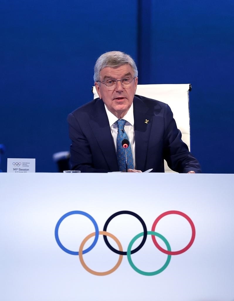 國(guó)際奧委會(huì)主席巴赫在會(huì)上發(fā)言。新華社記者 曹燦 攝