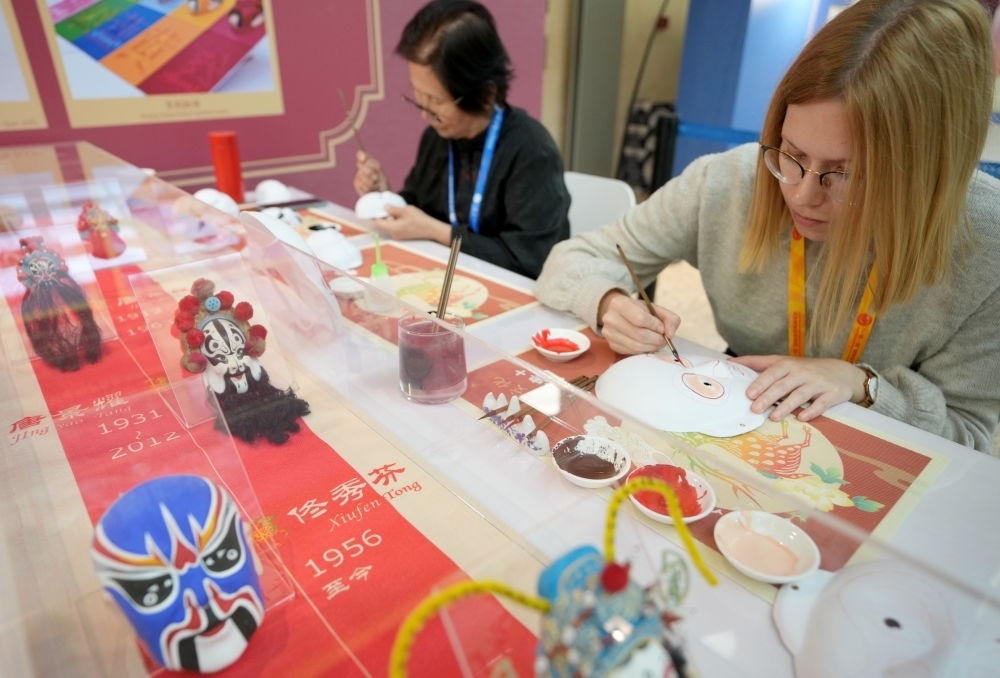 10月16日,在第三屆“一帶一路”國際合作高峰論壇新聞中心,來自比利時的記者(右)體驗(yàn)畫京劇臉譜。新華社記者 王毓國 攝
