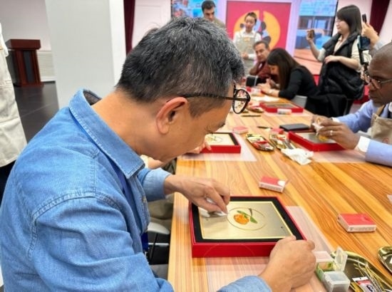 嘉賓在中國工藝集團(tuán)體驗(yàn)景泰藍(lán)制作過程 (新華社記者王艷剛攝)
