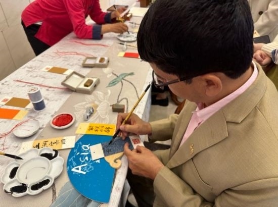 嘉賓體驗(yàn)中國書法書寫過程 (新華社記者王艷剛攝)