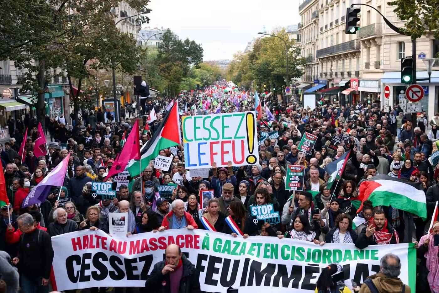 當(dāng)?shù)貢r(shí)間11日,民眾在法國(guó)巴黎參加支持巴勒斯坦游行 圖源:《衛(wèi)報(bào)》
