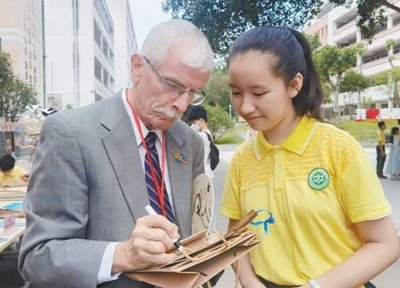 飛虎隊(duì)老兵后人蘭迪·斯科特為廣西柳州市壺西實(shí)驗(yàn)中學(xué)學(xué)生留言。本報(bào)記者 祝佳祺攝