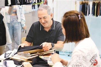 7月19日,在美國紐約舉辦的第24屆中國紡織品服裝貿易展覽會上,客商(左)在一家中國上海的企業(yè)展位選看面料。
