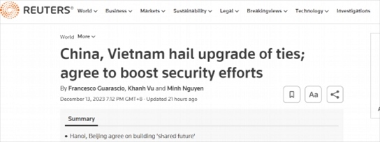 中國日報網(wǎng)12月14日電 12月12日,中國和越南共同宣布中越兩黨兩國關(guān)系新定位,在深化中越全面戰(zhàn)略合作伙伴關(guān)系基礎(chǔ)上,攜手構(gòu)建具有戰(zhàn)略意義的中越命運共同體。國際媒體對中越關(guān)系新定位進(jìn)行了密集報道,認(rèn)為雙邊關(guān)系更加重要,中越兩黨兩國關(guān)系邁上新臺階。
