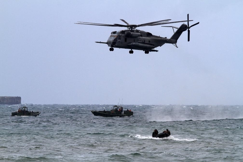 2013年9月20日,在菲律賓甲米地省,一架美軍CH-53E軍用直升機(jī)運(yùn)載美國(guó)和菲律賓士兵參加演習(xí)。新華社發(fā)(烏馬利攝)
