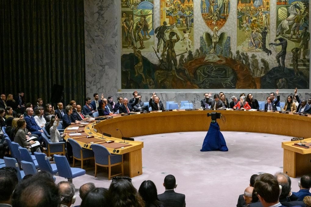這是12月8日在位于紐約的聯(lián)合國總部拍攝的聯(lián)合國安理會(huì)會(huì)議現(xiàn)場。美國當(dāng)天否決了聯(lián)合國安理會(huì)一份旨在推動(dòng)實(shí)現(xiàn)巴以人道主義?;鸬臎Q議草案。新華社發(fā)(聯(lián)合國供圖/洛伊·費(fèi)利佩攝)
