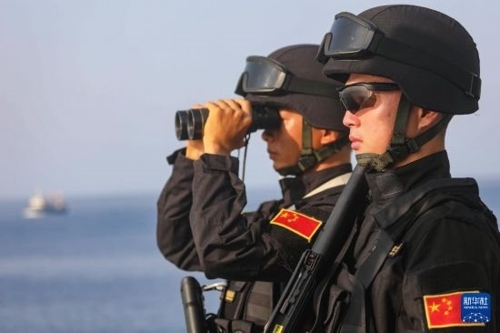 中國(guó)海軍第40批護(hù)航編隊(duì)岳陽(yáng)艦特戰(zhàn)隊(duì)員在護(hù)航途中觀察警戒(2022年4月2日攝)。新華社發(fā)(唐文攝)