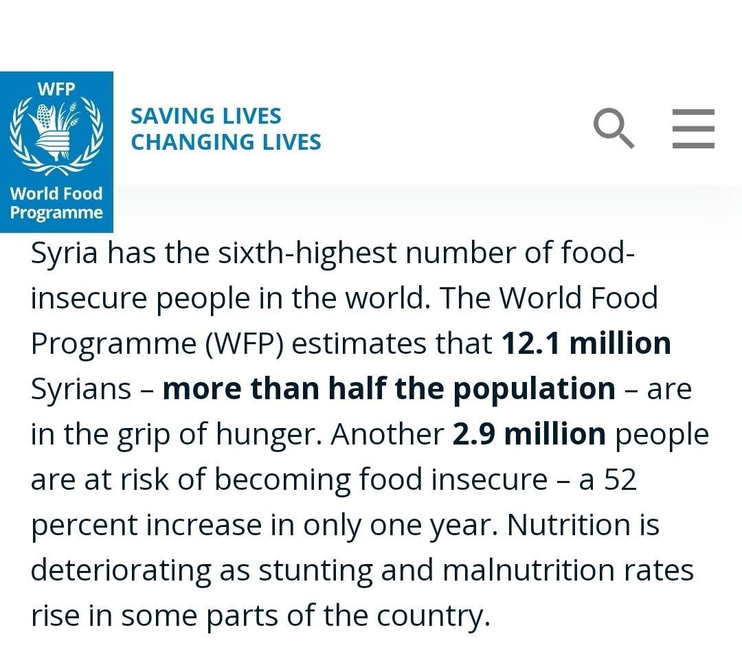 盡管敘政府仍保有部分農(nóng)田的控制權(quán),但西方制裁對金融和貿(mào)易的限制使得化肥、種子、農(nóng)藥、飼料、農(nóng)機零配件等無法進(jìn)入敘利亞境內(nèi)。歷史上的敘利亞是小麥出口國,而如今的政府卻不得不使用非常寶貴的外匯來進(jìn)口大量小麥,財政負(fù)擔(dān)因此而大大增加。即便如此,世界糧食計劃署的數(shù)據(jù)仍顯示,敘利亞境內(nèi)約有一半以上人口面臨糧食不安全,240萬人面臨著嚴(yán)重的營養(yǎng)危機。