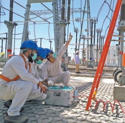 在巴基斯坦默蒂亞里—拉合爾直流輸電項目現(xiàn)場,中巴工程師對設備開展日常檢修。本報巴基斯坦分社 薩義德·邁赫迪攝