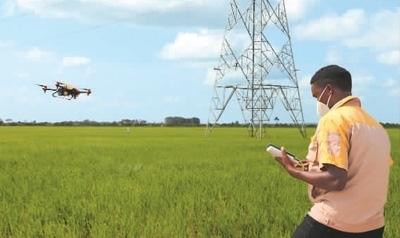 在烏干達(dá)卡隆古區(qū)盧卡亞鎮(zhèn)中億農(nóng)業(yè)園,作業(yè)員赫伯特·阿加巴操控植保無(wú)人機(jī)噴灑農(nóng)藥。新華社記者 張改萍攝