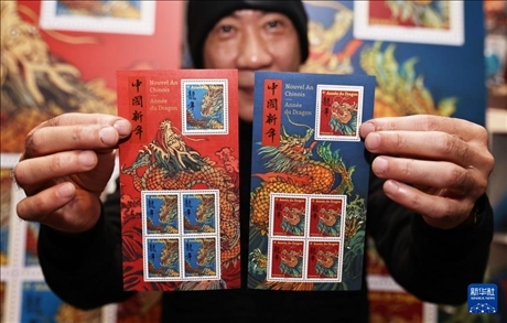 這是1月26日在法國巴黎拍攝的龍年生肖紀(jì)念郵票。新華社記者 高靜 攝