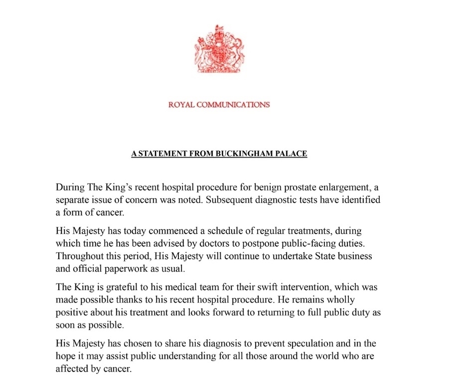 當(dāng)?shù)貢r(shí)間2月5日,白金漢宮發(fā)布消息稱,英國(guó)國(guó)王查爾斯三世在醫(yī)院的診斷檢查中被確診患有癌癥。