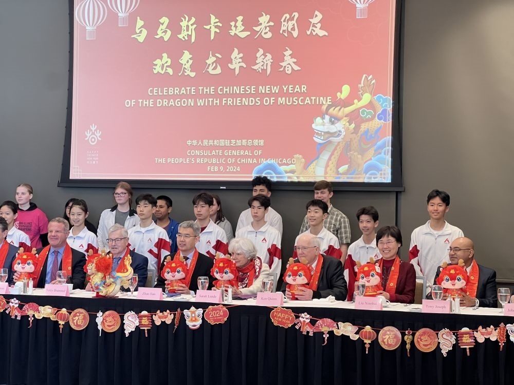 2月9日,在美國(guó)艾奧瓦州馬斯卡廷,中美新朋老友歡度龍年新春。