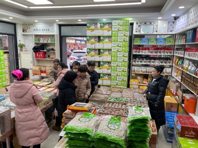 這是湖南長沙高橋大市場堅果經(jīng)銷商李海麗(右一)在向顧客介紹非洲堅果。新華社記者 余春生 攝