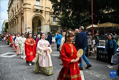 馬耳他民眾和當(dāng)?shù)赜慰?7日在地中海古城瓦萊塔的街道上欣賞到一場美妙的“漢服秀”。20多名中外女性漢服愛好者身著漢服,或手持團扇,或提著宮燈,在地中海的微風(fēng)中款款而行。