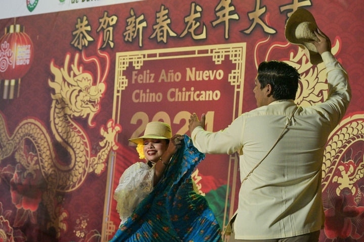 2月17日,在巴拿馬奇里基省首府戴維市,兩名身穿巴拿馬民族服飾的舞者在奇里基春節(jié)慶祝活動上表演。新華社記者陳昊佺攝