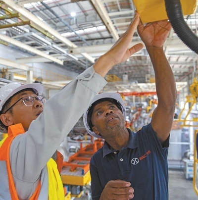 中國和南非兩國員工在南非東開普省北汽南非工廠焊裝車間內工作。新華社記者 張譽東攝