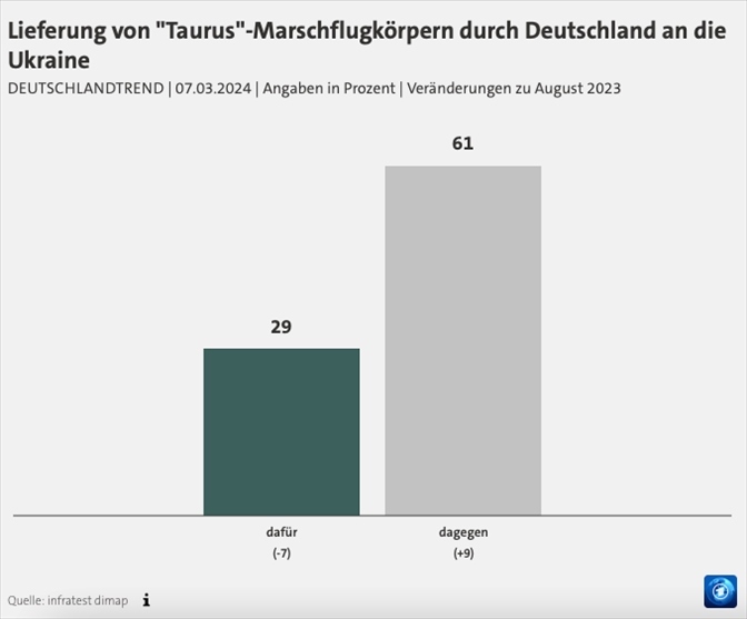 根據(jù)德國電視一臺當?shù)貢r間7日公布的最新“德國趨勢”民調(diào),在“竊聽門”事件發(fā)生后,61%的德國民眾反對向烏克蘭提供“金牛座”巡航導(dǎo)彈,較去年8月的民調(diào)結(jié)果增長了9%;支持的民眾數(shù)量減少了7%,占比僅為29%。民調(diào)還顯示,70%的受訪者擔(dān)心間諜活動增加,67%的人擔(dān)心德國對此缺乏準備,還有62%的民眾擔(dān)心德國可能會直接卷入戰(zhàn)爭。