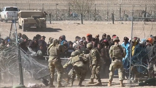 視頻畫面顯示,大批成年男性沖破州政府設(shè)置的鐵絲網(wǎng),將得州國(guó)民警衛(wèi)隊(duì)的一些士兵撞倒,并跑向邊界墻。 現(xiàn)場(chǎng)一片混亂,可以聽到有士兵對(duì)移民大叫“滾回去!”