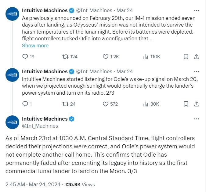 “經(jīng)過數(shù)天等待,已確認(rèn)‘奧德修斯’電力系統(tǒng)已不能支持它再次完成通信,”聲明寫道?!斑@證實(shí)‘奧德修斯’作為首個(gè)由私營(yíng)企業(yè)發(fā)射的月球著陸器永久休眠。”