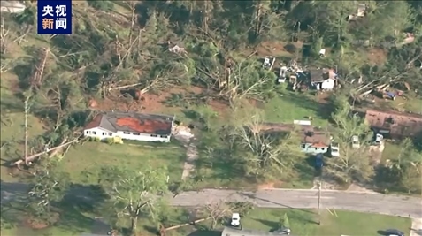 當?shù)貢r間4月3日,美國佐治亞州羅克代爾縣遭遇龍卷風襲擊。航拍畫面顯示,當?shù)氐姆课莺蜆淠驹獾絿乐仄茐摹?/p>
