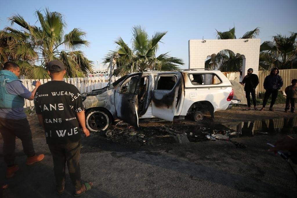 ?4月2日,在加沙地帶中部代爾拜拉赫,巴勒斯坦人在空襲過后查看被毀的汽車。巴勒斯坦紅新月會2日發(fā)表聲明說,以色列軍隊1日晚空襲加沙地帶中部城市代爾拜拉赫,造成慈善組織“世界中央廚房”7名工作人員死亡。新華社發(fā)(亞西爾·庫迪攝)