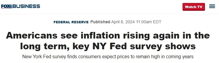 福克斯商業(yè)頻道在其另一篇報(bào)道中提到,據(jù)8日公布的一項(xiàng)紐約聯(lián)邦儲(chǔ)備銀行(Federal Reserve Bank of New York)進(jìn)行的消費(fèi)者預(yù)期調(diào)查顯示,美國人正在為未來幾年的高通脹率做準(zhǔn)備,公眾普遍的預(yù)期中值為從現(xiàn)在起一年內(nèi)通脹率將上升3%,與前幾個(gè)月持平,并在未來幾年通脹將保持高位,這表明他們認(rèn)為粘性通脹恐會(huì)持續(xù)下去。