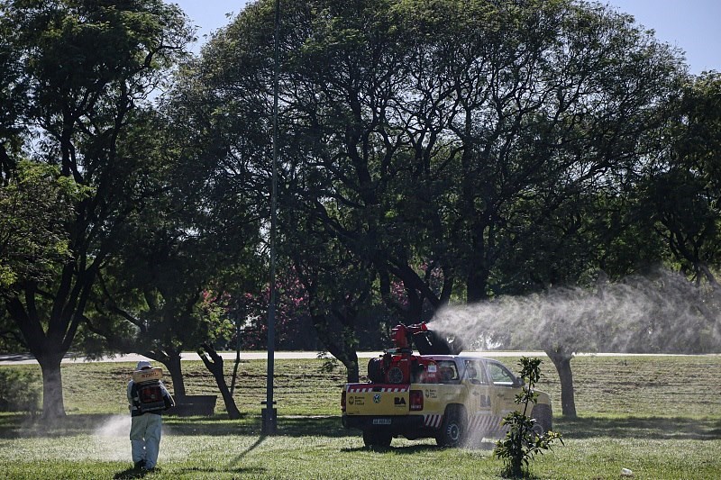 △當(dāng)?shù)貢r間4月6日,阿根廷布宜諾斯艾利斯一個公園里,工人在噴灑化學(xué)藥劑滅蚊。