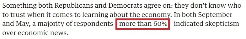 而無論是共和黨人還是民主黨人,幾乎所有受訪者都同意的一點(diǎn)是:在了解經(jīng)濟(jì)情況方面,他們不知道該相信誰。民調(diào)顯示,超六成美國人對經(jīng)濟(jì)新聞的真實(shí)性表示質(zhì)疑。