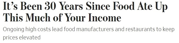 《華爾街日報(bào)》報(bào)道稱,持續(xù)的高成本導(dǎo)致食品制造商和餐館繼續(xù)抬高價(jià)格,“食物支出‘吃掉’這么多收入,已經(jīng)是30年前的事”。