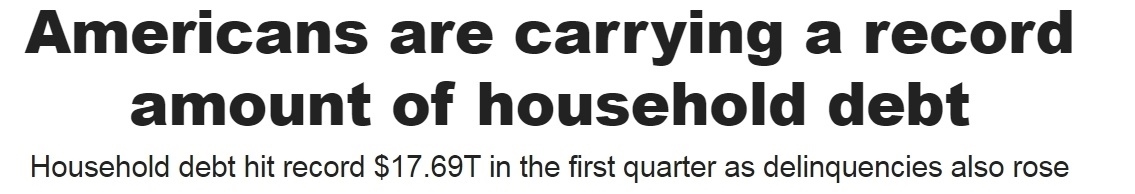 美國紐約聯(lián)邦儲備銀行公布的最新數(shù)據(jù)顯示,今年一季度,美國家庭債務(wù)總額達(dá)到17.69萬億美元(約合人民幣128萬億元),創(chuàng)下歷史新高。