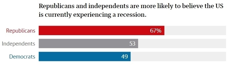 哈里斯民調(diào)公司進(jìn)行的民調(diào)顯示,67%的共和黨人認(rèn)為,美國經(jīng)濟(jì)正在萎縮,通貨膨脹正在加劇,整體經(jīng)濟(jì)正在惡化;而民主黨人中持相同觀點(diǎn)的人只有49%;此外,共和黨人比民主黨人更加相信,拜登政府的管理不善導(dǎo)致經(jīng)濟(jì)惡化。