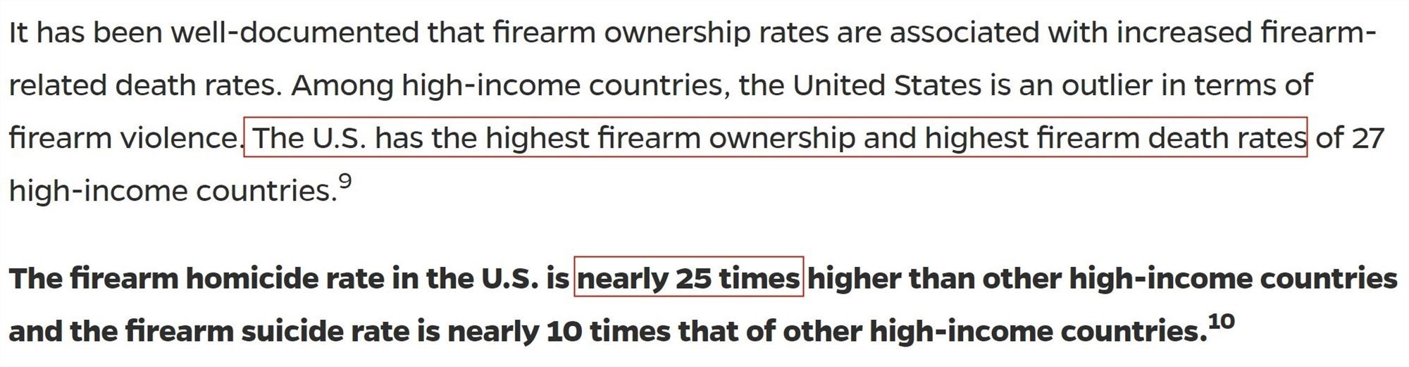 △約翰斯·霍普金斯大學(xué)槍支暴力解決方案中心官網(wǎng):數(shù)據(jù)表明,槍支擁有率與槍支相關(guān)的死亡率上升密切相關(guān)。在高收入國家中,美國的槍支擁有率和槍支引發(fā)的死亡率最高,是其他高收入國家的近25倍。